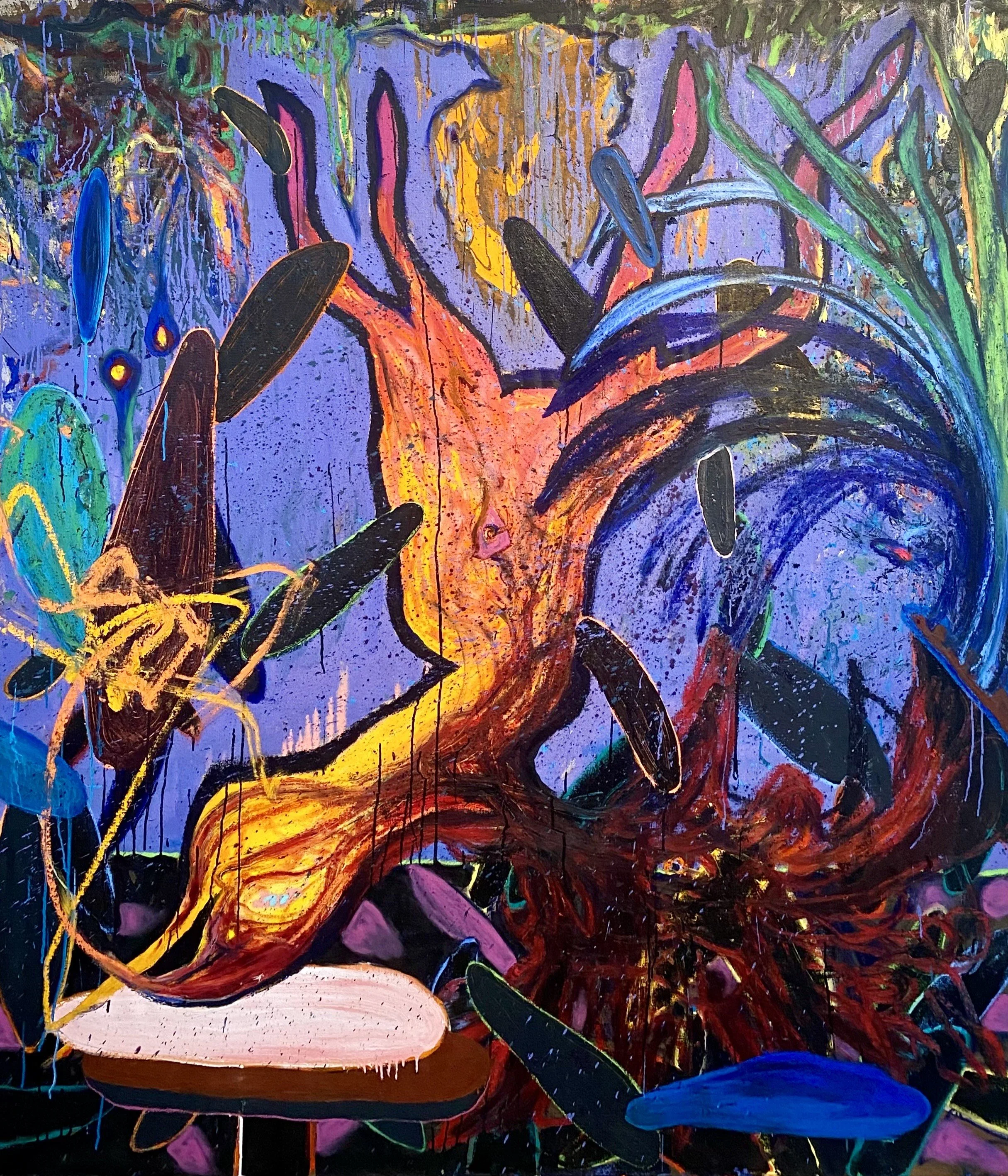 I de større fritstående arbejder går tankerne mere i retninger af habitater for ukendte væsner, og referencerne trækker både mod rokokoens slyngninger og arabesker og japanske tegnefilms eventyrlige blanding af det nuttede og det voldsomme.